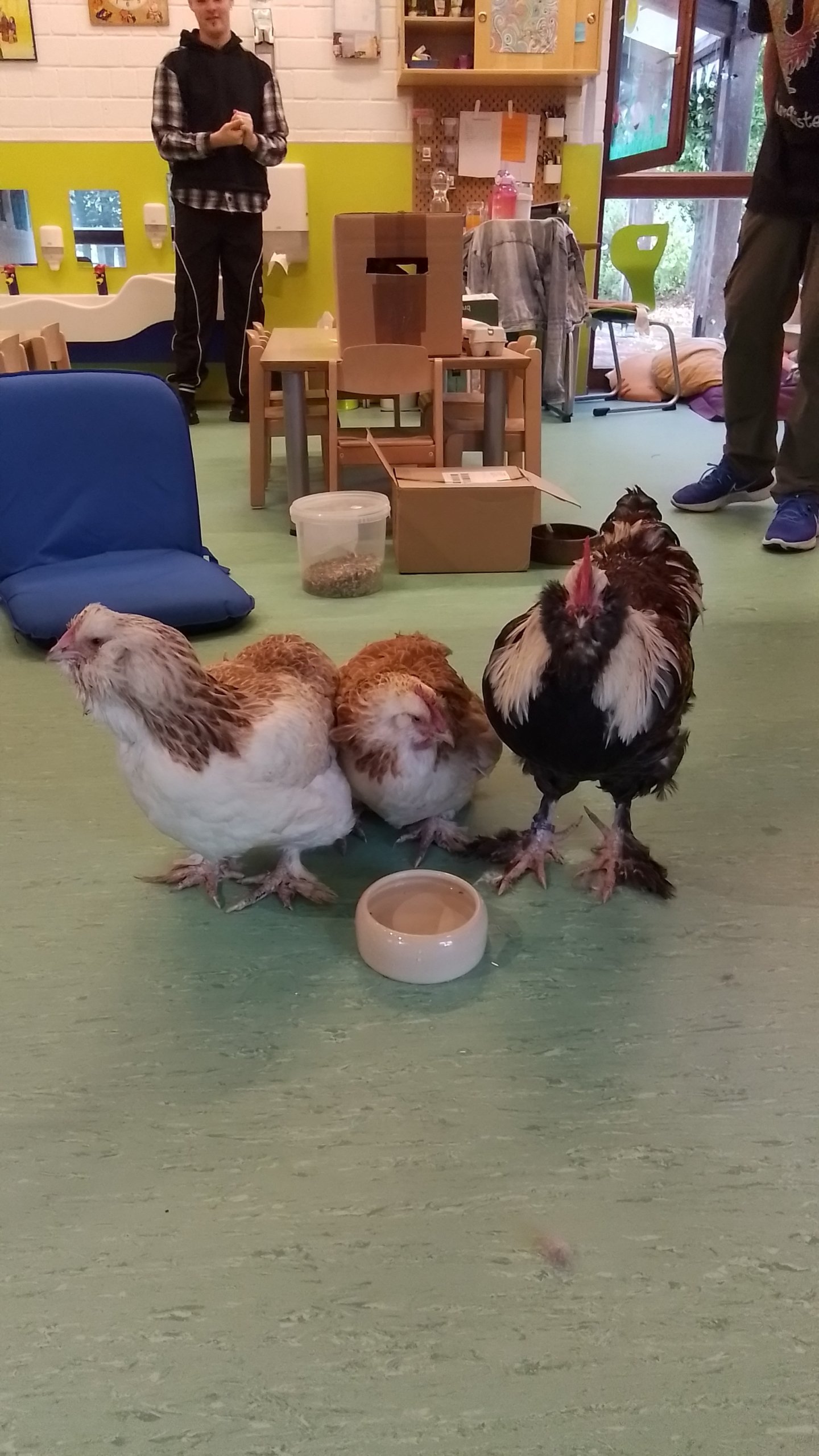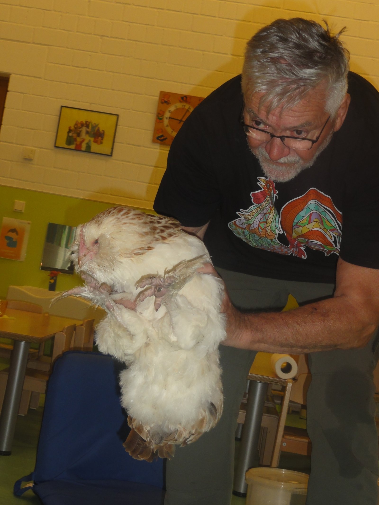 Ein weiteres Highlight ist der Besuch der Hühner mit Herrn Langen. Herr Langen hat uns 4 Hühner inklusive Hahn mitgebracht. Er erklärt uns einiges darüber, was die Hühner und der Hahn so essen und gibt ihnen etwas zu trinken. Dann dürfen die Kinder, die möchten, die Hühner sogar streicheln. Manch einer ist dann allerdings doch etwas skeptisch. Der Hahn breitet auch einmal seine Flügel aus und zeigt sie uns.