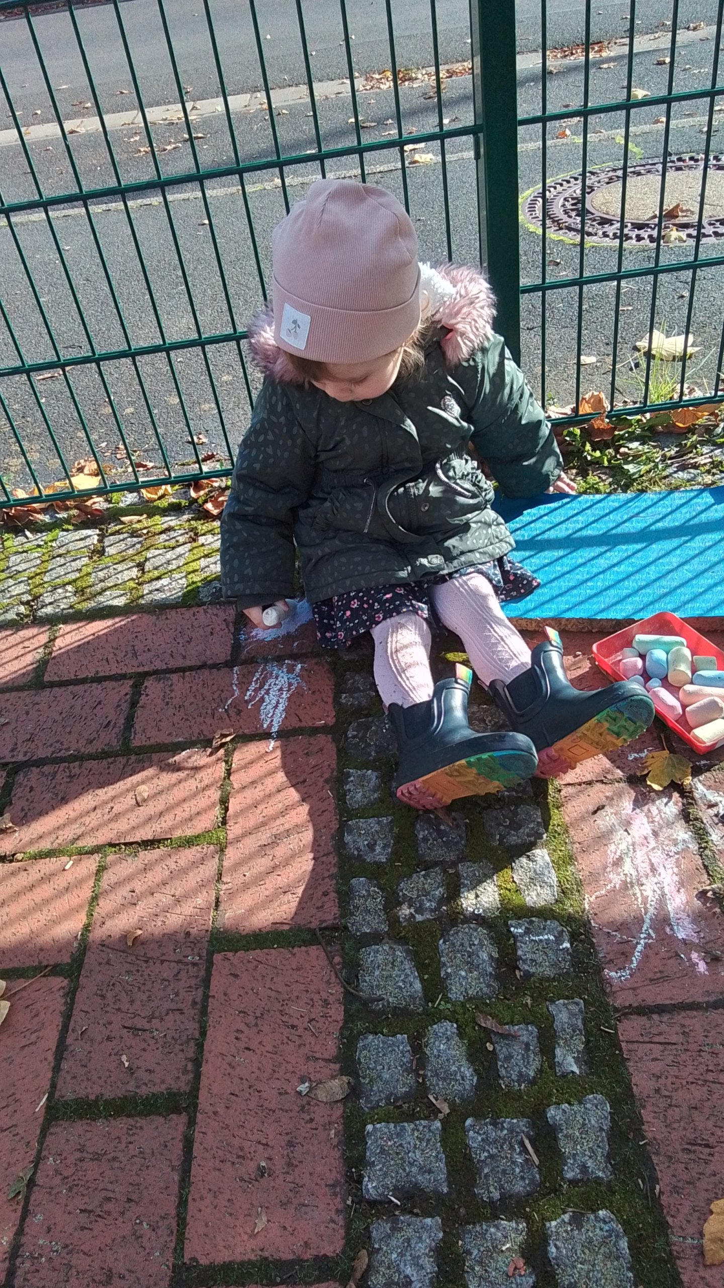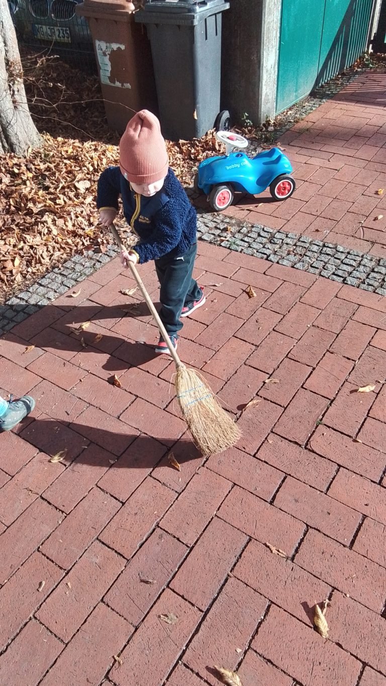 Bei schönstem Herbstwetter gehen wir in den Hof. Die Bäume haben schon jede Menge Blätter abgeworfen, die man sammeln oder mit einem Besen aufkehren kann. Und wenn man auf einem Sitzkissen sitzt kann man auch mal schön mit Straßenkreide malen.