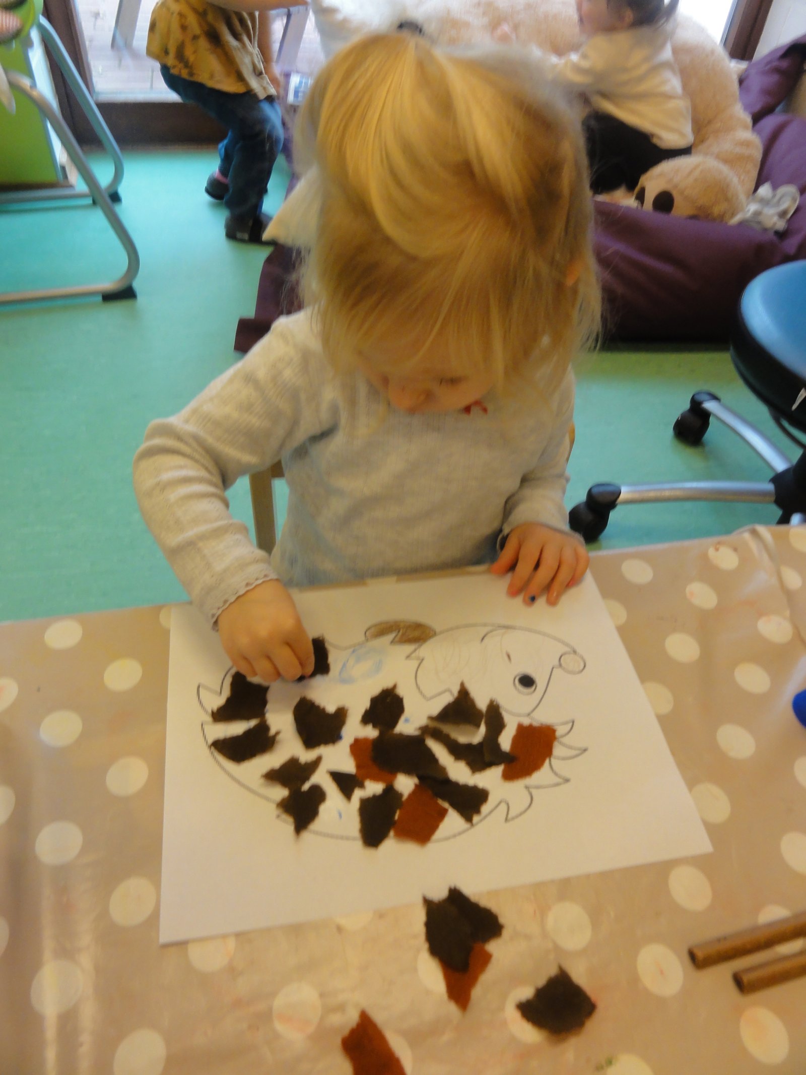 Wir kleben mit braunen Papierschnipseln einen Igel auf Papier und fördern so die Feinmotorik. Aber auch der Spaß bleibt dabei natürlich nicht auf der Strecke.